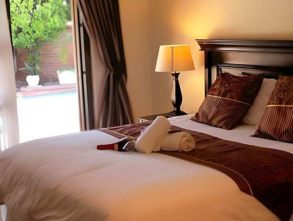 This luxury room has a private entrance and air conditioning. It is features pastel colored walls, tiled floors and modern wooden furnishings.